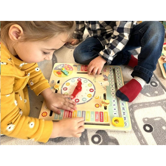 Dřevěný kalendář pro děti v českém jazyce je krásnou hračkou i dekorací do dětského pokoje. Kalendář s lesními zvířátky provede děti celým rokem. Děti se za pomocí roztomilých zvířátek naučí rozeznávat roční období, dny v týdnu i v měsíci, měsíce v roce a dokonce poznávat čas. Uprostřed kalendáře jsou totiž umístěné velké hodiny s červenými ručičkami.
