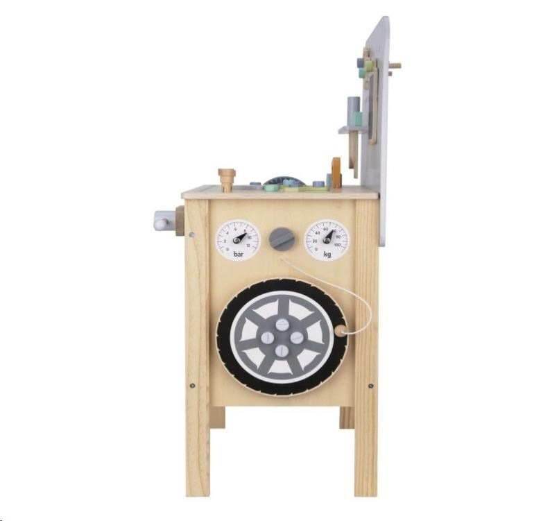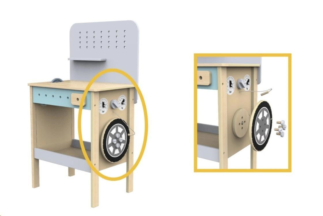 - Kompresor - tento zábavný doplněk umožní dětem vžít se do role automechanika, nasadit kolo na ponk, hrát si na to, že kolo dofukuje a opět kolo z ponku sundat.