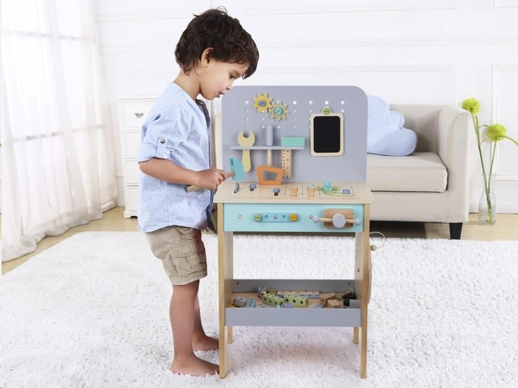 Originální dřevěný ponk se spoustou příslušenství a s kompresorem nadchne každého malého kutila. Dětský ponk v jemných pastelových barvách s nářadím, šrouby, matkami a hlavně se spoustou vychytávek potrénuje jemnou motoriku, manuální zručnost, koordinaci očí a rukou, rozvíjí kreativitu, učí děti soustředit se a trpělivosti.