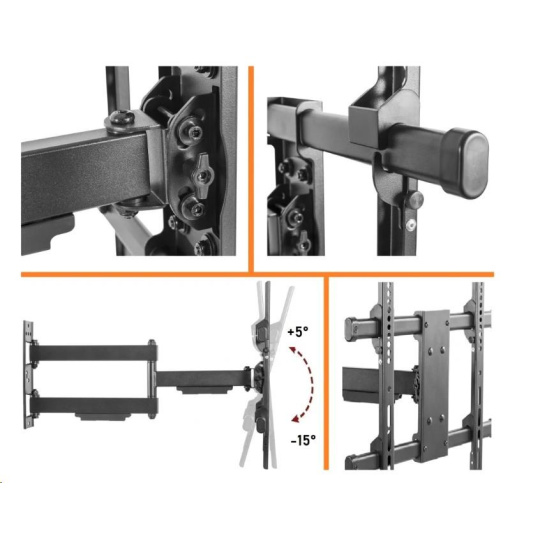 Otočný sklopný výsuvný držák Tv Fiber Mounts RAPTOR Kvalitní držák Tv 43" - 60", vzdálenost od zdi 62 - 615mm, otočný až +90° / -90°, naklápění +5° / -15°, kvalitní pevná konstrukce, úchytky na kabeláž, instalační materiál, VESA 200x100 až 400x400, nosnost 50kg, záruka 10 let Kvalitní nástěnný držák na televize Fiber Mounts RAPTOR Představujeme Fiber Mounts RAPTOR - kvalitní držák pro televizi, který promění váš obývací pokoj v dynamické multimediální centrum. S Fiber Mounts RAPTOR se každý filmový večer stane nezapomenutelným zážitkem, a každý sportovní přenos tak živým, jako byste byli přímo na stadionu. Nenechte se svazovat statickým umístěním vaší televize. Díky otočnému mechanismu +90° / -90° a naklápění +5° / -15° si můžete obrazovku nastavit přesně podle vašich potřeb. Ať už chcete sledovat oblíbený film z pohodlí gauče, křesla nebo potřebujete upravit úhel pohledu pro videohovor, Fiber Mounts RAPTOR vám to umožní s lehkostí. Navíc, s vzdáleností od zdi 62 - 615mm poskytuje Fiber Mounts RAPTOR nejen flexibilitu v umístění, ale také jednoduchý přístup k zadním portům vaší televize pro rychlé připojení nebo odpojení zařízení. A díky pevné konstrukci a nosnosti až 50kg můžete mít jistotu, že váš 43" - 60" televizor bude v bezpečí. Nezapomněli jsme ani na estetickou stránku. S úchytkami na kabeláž bude váš obývací pokoj vždy vypadat uklizeně a organizovaně, bez rušivých kabelů visících z televize. A s přiloženým instalačním materiálem a zárukou 10 let je montáž a používání Fiber Mounts RAPTOR hračka. Televizní držák kvalitní robustní konstrukce Fiber Mounts RAPTOR Technické údaje: nosnost 50kg podpora VESA standardů pro zavěšení Tv 200x100 až 600x400 ideální na televize a obrazovky s úhlopříčkou 43" až 60" nastavitelná vzdálenost od zdi 62 - 615mm otáčení obrazovky do stran až +90° / -90° naklápění +5° / -15° korekce roviny obrazovky +3° / -3° kvalitní velmi pevná konstrukce úchytky na kabeláž nástěnný úchyt o rozměrech 275 x 90mm barevné provedení černé záruka 10 let.