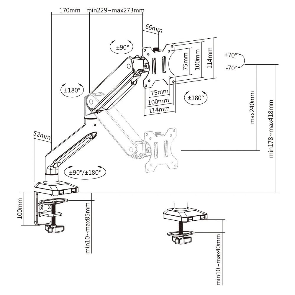 Profesionální stolní držák na monitor Tv 15-35", otočný +/-180°, sklopný +/-45°, maximální výška 418mm, výškové polohování 24cm, délka max. 443mm, 2 typy úchytů na stůl, VESA 75x75 a 100x100, nosnost 15kg.... více