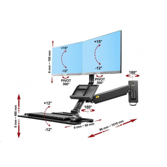 Držák na 2 monitory a klávesnici Fiber Mounts MC27-2AB Profesionální nástěnná pracovní stanice na 2 monitory 17-27" a klávesnici s myší Pracovní stanice s nástěnným držákem na 2 monitory (uchycení vedle sebe) s policí na klávesnici a myš. Kompletní nastavení pozic monitorů i police, plná polohovatelnost - otáčení, naklápění, výškové polohování, odsazení od zdi. Instalace na svislé povrchy (zeď, příčka, sloupek, pilíř, stroje atd.). Nejvyšší kvalita, krásný dizajn, snadná ovladatelnost - profesionální výrobek. Barva černá, záruka 3 roky. Nástěnná pracovní stanice s držákem na 2 monitory a policí na klávesnici a myš, výškové polohování pro práci v sedě i vestoje, otáčení naklápění - Fiber Mounts MC27-2AB Technické údaje: minimální zatížení 6kg (kvůli tuhosti plynového pístu) maximální zatížení 12kg ideální na monitory s úhlopříčkou 17" až 27" nastavení požadované pozice monitorů naklápění +10° až -15° výškové polohování od police 100mm funkce pivot maximální vzdálenost mezi držáky monitorů 670mm polohování ramene držáku otáčení do stran +180°/-180° výškové polohování 480mm nastavení vzdálenosti od zdi 90mm (zaklopená polička) až 1010mm polička na klávesnici s myší rozměry 560mm x 200mm nastavení náklonu police +12°/-12° úprava vzdálenosti police od monitorů až 60mm možnost zaklopení police na klávesnici a myš přihrádka na dokumenty, poznámky,vizitky, zápisník atp. systém vedení kabeláže profesionální zpracování, nejvyšší kvalita barevné provedení černé záruka 3 roky.