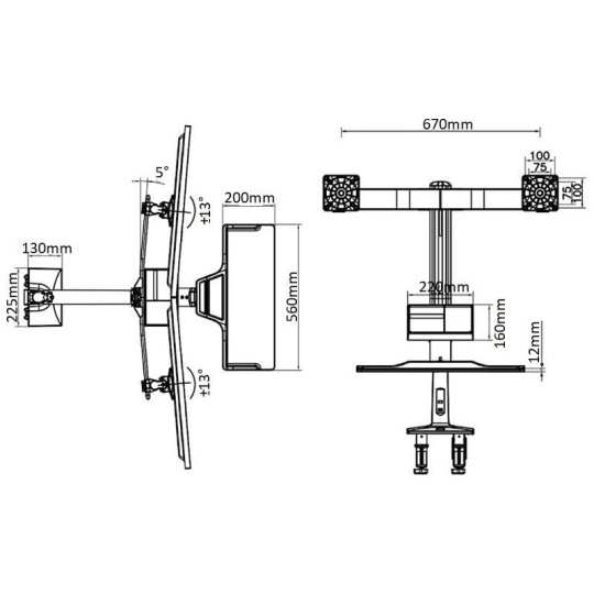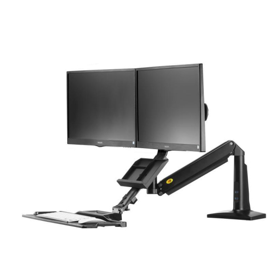 Stolní držák pro dva monitory 17-27" s policí na klávesnici, ergonomický pro práci vsedě nebo vestoje, kompletní polohovatelnost, VESA 75x75 a 100x100, nosnost 15kg.... více