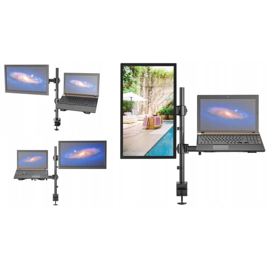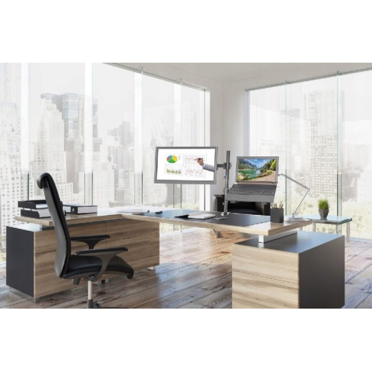 Držák notebooku nebo laptopu a monitoru Fiber Mounts FM23 Kvalitní sestava stolní držák na monitor 15-27" a držák na notebook laptop 13-17", polohovatelný, stabilní a pevný Vybavte si kancelář skvělým pomocníkem, který Vám uspoří spoustu místa a zlepší ergonomii při práci. Sestava Fiber Mounts FM23 obsahuje držák na monitory 15-27" a držák na notebooky nebo laptopy s úhlopříčkou 13-17". Držák monitoru podporuje VESA 75x75 a 100x100, lze ho otáčet do stran, naklápět, rotovat a výškově polohovat. Držák notebooku lze otáčet do stran a výškově polohovat. Barevné provedení černé, celková nosnost 20kg, celokovová konstrukce. Stolní držák na monitor a notebook do vaší kanceláře - Fiber Mounts FM23 Technické údaje: nosnost 20kg na monitory 15-27" na notebooky 13-17" VESA standard 75x75 a 100x100 otáčení do stran +/- 135° naklápění monitoru +/- 90° uchycení na stolové desky s tloušťkou 10-100mm barva černá záruka 3 roky Stolní držák na monitor a notebook do vaší kanceláře - Fiber Mounts FM23 Držák na monitory podporuje standardy VESA: VESA 75x75 VESA 100x100.
