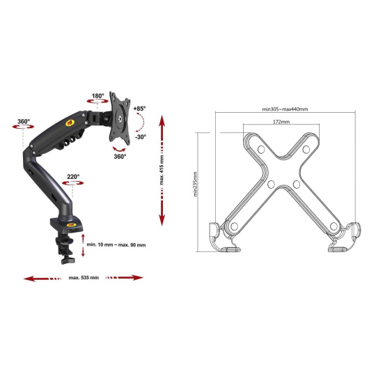 Stolní držák na notebook laptop Fiber Mounts 836F80 Kvalitní stolní držák na notebook nebo laptop 11-17,1", výškové polohování 165-415mm, otočný +/-180°, náklon notebooku 0° až -90°, vzdálenost od uchycení 0-535mm, vedení kabeláže, nosnost 9kg Unikátní systém pro uložení notebooku a jeho snadnou a rychlou polohovatelnost. Držák Vám umožní notebook výškově polohovat, otáčet do stran, měnit místo na stole kdykoliv, snadno, rychle a pohodlně. Držák je velmi přívětivý ohledně nastavitelnosti. Vhodný je pro uložení jakéhokoliv notebooku s hmotností až 9kg. Na držáku jsou krytky pro možnost skrytého vedení kabeláže. Možnost uložení notebooku nebo laptopu uvítá každý, kdo s ním denně pracuje - nastavení polohy obrazovky notebooku do úrovně očí (účinné proti bolesti zad, páteře a hlavy). Možnost kombinovat i s držákem monitoru F80 a v případě používání druhého monitoru sjednotit výšku obrazovky notebooku s monitorem. Stolní držák na notebook laptop do kanceláře pracovny nebo dětského pokoje Fiber Mounts 836F80 Technické údaje: max. zatížení 9kg uchycení jakéhokoliv notebooku laptopu velikosti 11" až 17,1" šířka notebooku musí být v rozmezí 280mm až 440mm výšková polohovatelnost 250mm (165-415mm) nastavení vzdálenosti od stolního uchycení až 535mm otáčení do stran bez omezení +/- 180° nastavení náklonu notebooku 0° (vodorovně) až -90° (svisle) snadná korekce roviny rychlá a snadná změna polohy notebooku na stole uchycení držáku na hranu stolové desky nebo skrz stolovou desku šroubem vynikající kvalita systém pro skryté vedení kabeláže 2 typy uchycení na stolovou desku (na okraj nebo do prostoru) barva černá záruka 3 roky.
