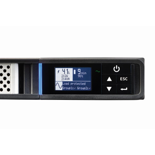 - Nový grafický LCD displej poskytuje na jedné obrazovce základní informace o stavu UPS a o měřených veličinách (v sedmi jazycích podle volby). K dispozici jsou rovněž rozšířené možnosti konfigurace pomocí srozumitelných navigačních tlačítek.