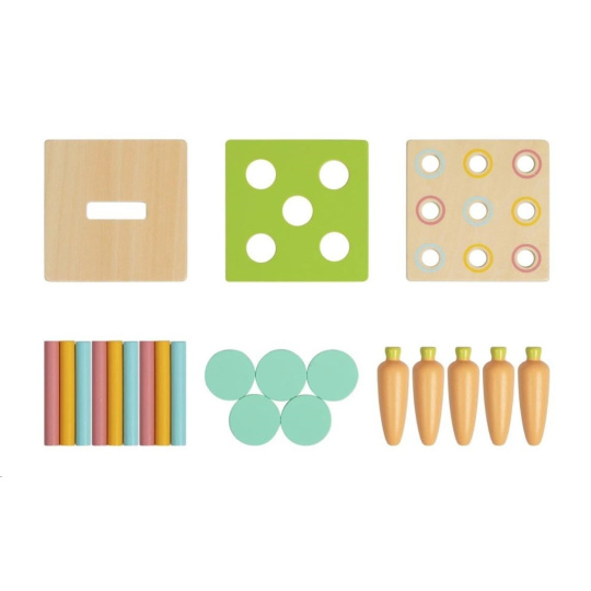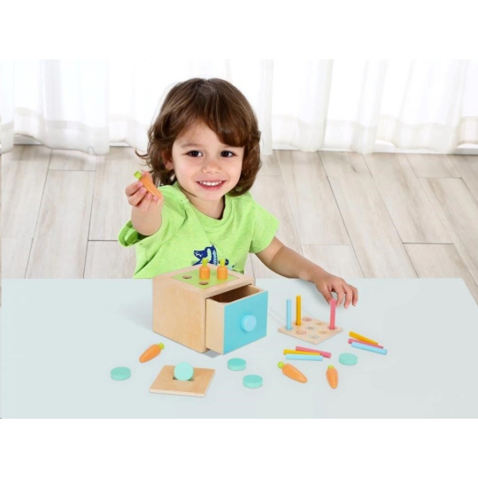 Dřevěná edukační hračka (box), pro děti od 1 roku, představuje hned 3 hračky v jednom. Multifunkční bedýnka (box) s výměnitelným horním dílem je zábavnou vkládačkou s mrkvičkami, s barevnými válečky nebo pokladničkou. Díky 3 výměnitelným destičkám děti mohou hrát různé hry, zdokonalovat své dovednosti a užít si spoustu legrace.