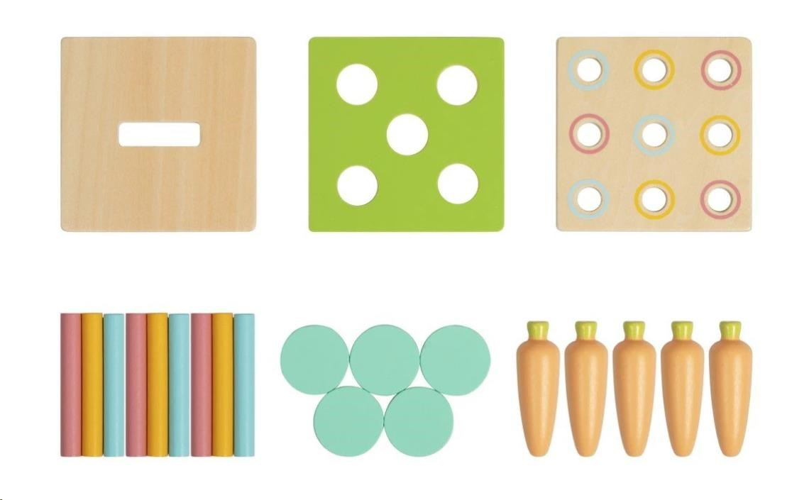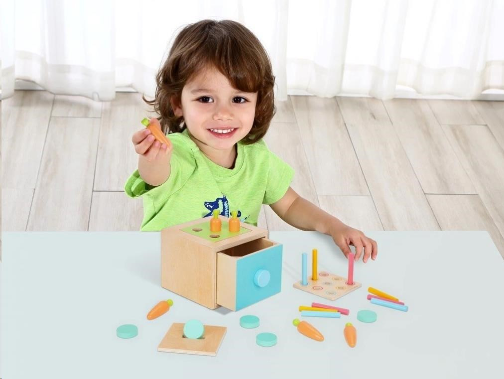 Dřevěná edukační hračka (box), pro děti od 1 roku, představuje hned 3 hračky v jednom. Multifunkční bedýnka (box) s výměnitelným horním dílem je zábavnou vkládačkou s mrkvičkami, s barevnými válečky nebo pokladničkou. Díky 3 výměnitelným destičkám děti mohou hrát různé hry, zdokonalovat své dovednosti a užít si spoustu legrace.