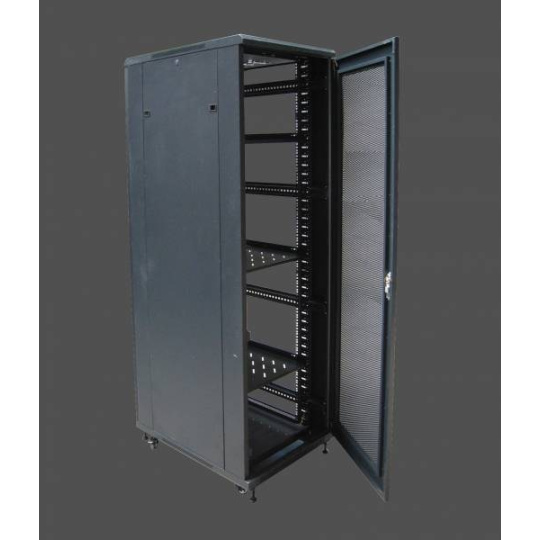 Rozvaděč je standardně vybaven výškově přestavitelnými policemi (3ks pro 42U), panelem se zásuvkami 230V, ventilační jednotkou a sadou spojovacího materiálu. Plechové uzamykatelné dveře na přední i zadní stěně. Odnímatelné boční kryty s možností montáže zámku. Dodáváno v rozloženém stavu.