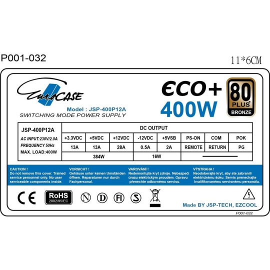EUROCASE zdroj 400W Eco+, 120mm, 80+ Bronze, ATX