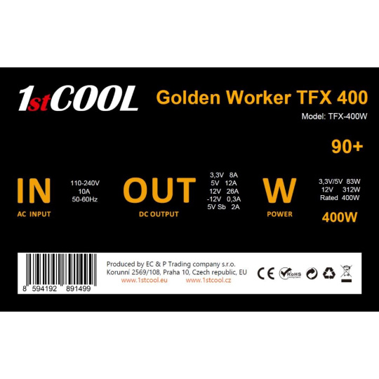 1stCOOL Zdroj Golden Worker TFX 400 88+, 400W, TFX, černá