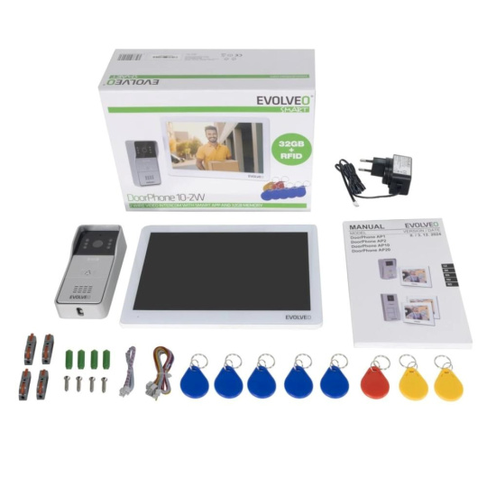 Balení obsahuje všechno potřebné: venkovní jednotku s kamerou a RFID čtečkou, vnitřní dotykový monitor s Wi-Fi, montážní materiál, napájecí adaptér, propojovací kabely i základní sadu RFID karet. A samozřejmě i přehledný návod k použití. Máte zde zkrátka k dispozici vše, co pro vytvoření moderního a bezpečného vstupního systému do vašeho domova potřebujete.