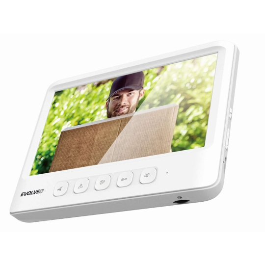 barevný displej 7", IR LED přísvit, 110° zorný úhel, antivandal certifikace IK06, voděodolnost IP44, vnitřní paměť až na 120 fotografií, slot na MicroSD kartu (32GB), podpora interkomu, možnost připojení CCTV kamer, funkce odposlechu, montáž na stěnu
