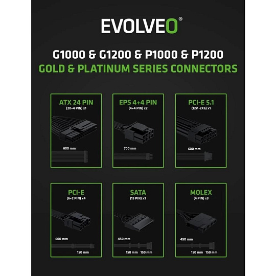 Zapomeňte na zamotané kabely, které brání proudění vzduchu a ještě vaší počítačové skříni kazí styl. Zdroj EVOLVEO G1000 je plně modulární, takže k němu připojíte jen ty kabely, které opravdu potřebujete. Součástí balení jsou všechny důležité šňůry – jeden kabel ATX 24 PIN, dva EPS 4+4 PIN, dva PCI-E 6+2 PIN, jeden PCI-E 5.1 12V-2×6, tři SATA a jeden MOLEX. Díky tomu máte místo na vše od CPU a GPU přes disky až po vymazlené LED pásky či jiné extra prvky.