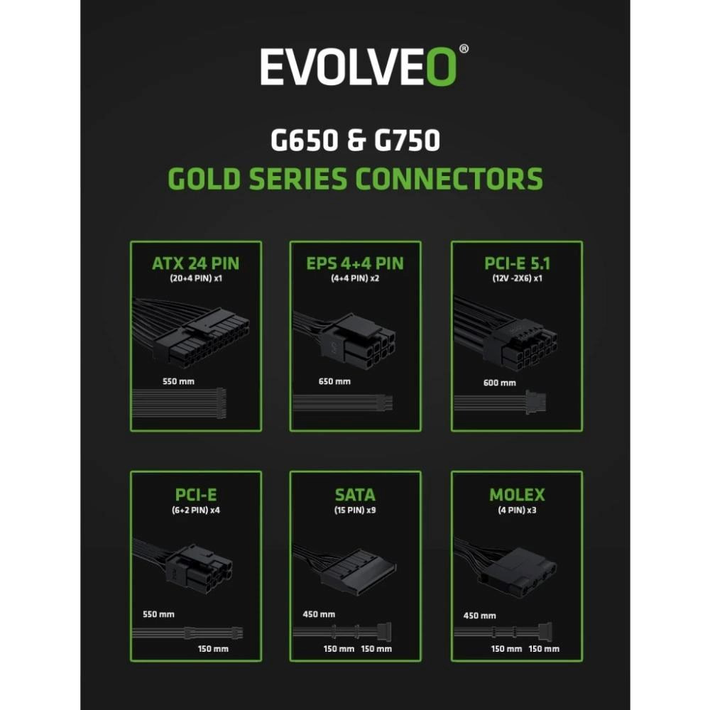 EVOLVEO G650 zdroj 650W, 80+ GOLD, ATX 3.1, aPFC, 140 mm ventilátor