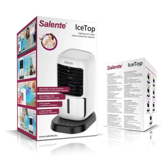 Multifunkční zařízení Salente IceTop plní funkci malého stolního ochlazovače vzduchu, který vám v horkých letních dnech nebo teplých prostorách bez možnosti klimatizace zpříjemní práci i soukromí. Současně plní funkci zvlhčovače a nedochází tak při jeho provozu k vysušování vzduchu jako je tomu u standardních klimatizací. Při provozu bez naplněné vodní nádržky plní funkci klasického stolního letního ventilátoru. Na jedno naplnění vodní nádržky vydrží v provozu 6 hodin.