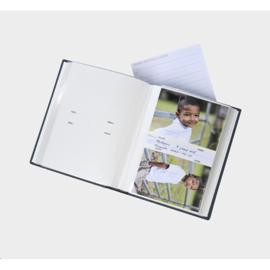 Bookbound album with textile cover. The album has pockets for 200 pictures up to size 10x15 cm. Memocards to write notes on between the photos..