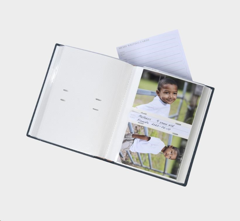Bookbound album with textile cover. The album has pockets for 200 pictures up to size 10x15 cm. Memocards to write notes on between the photos..
