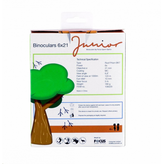 Focus Junior 6x21 je perfektní binokulární dalekohled, který nesmí chybět ve výbavě žádného malého pozorovatele. Výběr ze dvou barevných provedení ocení nejen chlapci, ale také dobrodružné dívky. Tento malý kapesní dalekohled je určen pro děti s rozpětím očí mezi 50 - 63 mm. Speciální konstrukce s jedním centrálním kloubem zajistí ideální stabilitu. Velké zaostřovací kolečko usnadňuje úpravu ostrosti a povrchová úprava optiky poskytuje jasný obraz. Kaučukové tělo je odolné proti nárazům a zároveň zajišťuje bezpečné a příjemné uchopení. Díky tomu se vyhnete nechtěným pádům z důvodu nepříjemného držení, což každý rodič ocení. Díky 6násobnému zvětšení dopřejete svým dětem možnost rychleji a snadněji spatřit ptáky nebo jiná zvířata, které děti jednoduše milují. Balení také obsahuje pouzdro na opasek, popruh na krk a čistící hadřík na optiku. Švédská značka Focus Sport Optics vyrábí optiku od roku 1985. Její produkty jsou ve Skandinávských zemích, kde je příroda nekompromisní, oblíbené díky skvělému poměru ceny a výkonu..