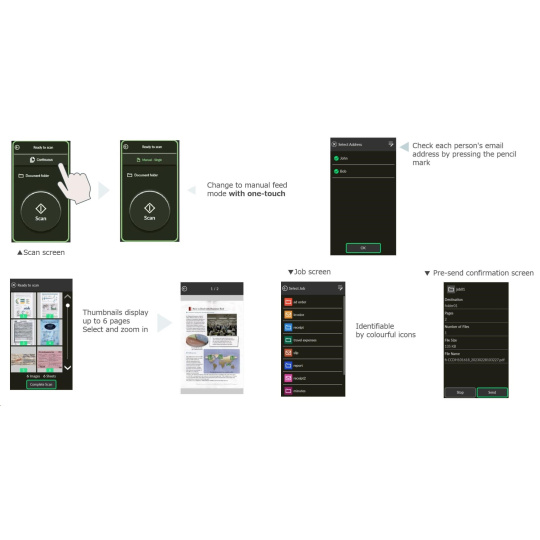 | Image Processing Functions | Advanced DTC, Automatic Colour Detection, Automatic Profile Selection, Automatic Rotation, Background Pattern Removal, Blank Page Detection, Character Extraction, Cropping, Custom Rotation, De-Screen, De-Skew, Dither, Dropout Colour (None / Red / Green / Blue / White / Saturation / Custom), Dynamic Threshold (iDTC), Edge Fill, Error Diffusion, Front Back Merging, Halftone, Image Emphasis, Index Tab Cropping, Multi Image Output, SDTC, Split Image, sRGB Output, Static Threshold, Vertical Streaks Reduction. When using DirectScan: Barcode Recognition, Blank Page Detection, De-skew and Cropping (Automatic size), Dropout Colour (Red, Green, Blue, None), Rotation (0°, 90°, 180°), SDTC | |