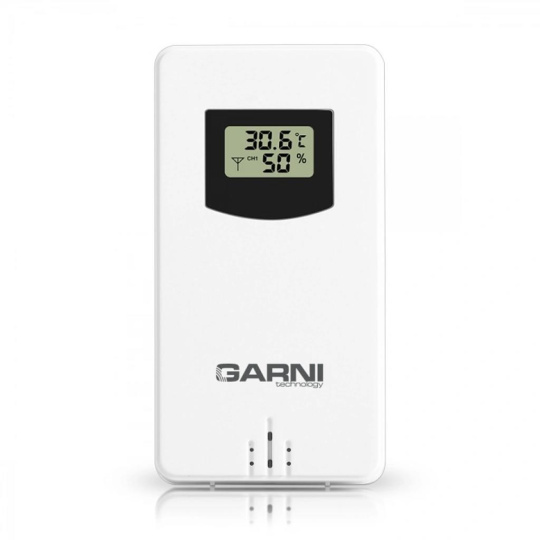 Bezdrátové čidlo pro měření teploty a relativní vlhkosti, určeno pro meteorologické stanice GARNI 439 Line, GARNI 545 Line vlhkosti odolné, krytí IPX4 (odolné proti stříkající vodě) displej o rozměrech 19 x 11 mm velikost číslic na displeji: teplota a relativní vlhkost 4 mm měření teploty a relativní vlhkosti 3 kanály maximální RF výkon 10 dBm (10 mW) možnost postavení a zavěšení barva bílá.