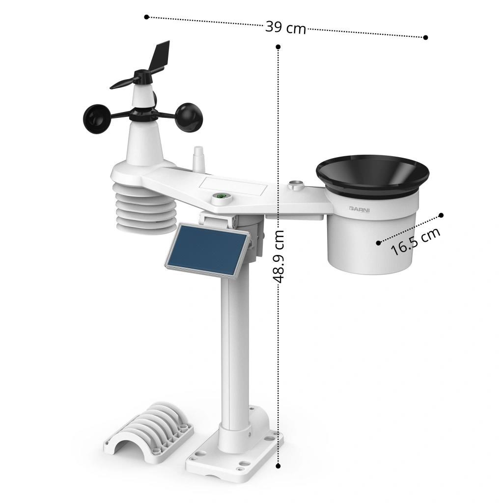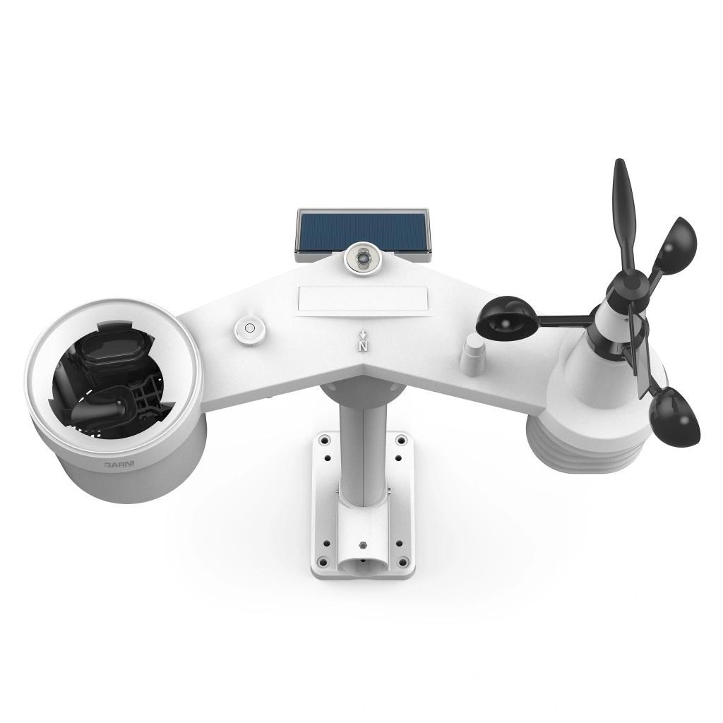 Integrované bezdrátové čidlo 7-v-1 GARNI 1NG měří vnější teplotu a relativní vlhkost, rychlost a směr větru, dešťové srážky, UV index a sluneční záření, a data jsou odesílána do hlavní jednotky až do vzdálenosti 150 m (v otevřeném prostoru).