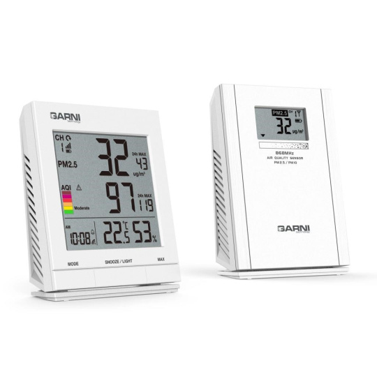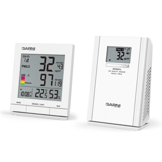 Měřič kvality vzduchu GARNI 204 OneCare je určen pro vnitřní použití. Měří a zobrazuje na svém LCD displeji hodnoty kvality vzduchu – koncentraci pevných částic PM2.5 a PM10 naměřenou bezdrátovým čidlem GARNI 104Q (jedno bezdrátové čidlo je součástí balení) a také teplotu a relativní vlhkost. Pro měření pevných částic (PM) je použito švýcarské čidlo SENSIRION řady SPS ? měření pevných částic (PM) PM2.5 a PM10 bezdrátovým čidlem GARNI 104Q ? hlavní jednotka měří teplotu a relativní vlhkost a zobrazuje hodnoty pevných částic PM2.5, nebo PM10 naměřené bezdrátovým čidlem GARNI 104Q ? pro měření pevných částic jsou použita přesná švýcarská čidla SENSIRION řady SPS ? jednotkou PM jsou µg/m3 ? přehledný LCD displej hlavní jednotky o rozměrech 69 x 64 mm ? velikost číslic na displeji – čas 6,5 mm, teplota, relativní vlhkost 12 mm, aktuální hodnota PM2.5, PM10 17 mm, maximální hodnota 7 mm, aktuální hodnota AQI 17 mm, maximální hodnota 7 mm ? zobrazení aktuálních hodnot PM2.5, PM10 a AQI, nebo průměrných hodnot naměřených za 24 hodin ? indikace kvality vzduchu barevnou stupnicí AQI (Air Quality Index) a číselnou hodnotou AQI ? paměť na maximální hodnotu PM2.5, PM10 a AQI od posledního vymazání paměti, za poslední hodinu a posledních 24 hodinalarm AQI upozorní na vysokou úroveň AQI na základě aktuálně naměřené hodnoty AQI nebo průměrné hodnoty za posledních 24 hodin. Jakmile je dosaženo hodnoty, která byla nastavena, aktivuje se zvukové znamení a na displeji hlavní jednotky začne blikat ikona alarmu ? možnost použití až 4 bezdrátových čidel GARNI 104Q ? při použití více bezdrátových čidel GARNI 104Q možnost automatického přepínání kanálů ? ikona signálu bezdrátových čidel ? čas řízený rádiovým signálem DCF-77 s možností manuálního nastavení ? ikona příjmu signálu DCF-77 ? 12, nebo 24 hodinový formát zobrazení času ? časová zóna -23 až +23 hodin ? zobrazení tepoty ve C, nebo F ? automatické přepínání letního a zimního času ? aktualizace naměřených hodnot - 60 sekund ? budík s funkcí Snooze (posunutí buzení o 5 minut) ? možnost krátkodobého osvětlení displeje na 9 sekund ? ikona slabých baterií ? napájení na baterie Bezdrátové čidlo GARNI 104Q ? pro vnitřní použití ? displej o rozměrech 37 x 21 mm ? velikost číslic 10 mm ? zobrazení hodnoty kvality vzduchu PM2.5, nebo PM10 ? 4 kanály ? zobrazení čísla kanálu, ikony slabých baterií, ikony vysílání a nabíjení na displeji ? vizualizace kvality vzduchu hodnotou koncentrace na šestiúrovňové stupnici ? aktualizace a přenos naměřené hodnoty kvality vzduchu při napájení USB adaptérem každých 60 sekund ? při napájení bateriemi měří bezdrátové čidlo GARNI 104Q ve výchozím nastavení koncentraci PM2.5 a PM10 automaticky každých 10 minut. Pro maximalizaci výdrže baterií lze změnit interval měření z 10 minut na 20 nebo 30 minut ? dosah signálu až 100 m v otevřeném prostoru ? frekvence přenosu 868 MHz ? napájení 3 x 1.2V NiMH nabíjecí baterie typu AA, nebo přes USB adaptér (adaptér není součástí balení) , nabíjení přes USB (5V/1A) Obsah balení 1 x hlavní jednotka 1 x bezdrátové čidlo GARNI 104Q 3 ks nabíjecích baterií typ AA, 1,2 V, Ni-MH, 2000 mAh 1 x USB kabel 120 cm CZ, SK, EN návod, QR kód s odkazem ke stažení návodů DE, NL, PL, HU.