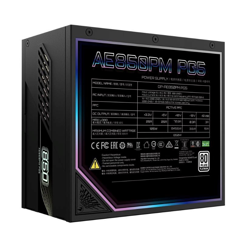 AE850PM PG5 dokáže vydržet až 3násobek výkonu GPU a 2násobek celkového výkonu. Je plně kompatibilní se standardem Intel ATX 3.1, podporuje až 200% výkyvy výkonu a dosahuje 70% účinnosti při nízké zátěži. Přiložený vysoce kvalitní nativní 16kolíkový kabel navíc zajišťuje kompatibilitu s grafickými kartami PCIe Gen 5 a poskytuje výkon až 600 wattů.