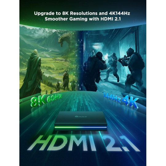 Govee AI Sync Box Kit 2 je vybaven HDMI 2.1, což umožňuje podporu pokročilých funkcí, jako jsou Dolby Vision, ARR a ALLM. Díky této technologii můžete očekávat špičkovou kvalitu obrazu s bohatými barvami a vyšší dynamikou, ideální pro moderní domácí kino a herní sestavy. HDMI 2.1 zajišťuje optimální kompatibilitu s nejnovějšími standardy, což znamená plynulé přepínání režimů a minimální latenci pro dokonale synchronizovaný vizuální zážitek.