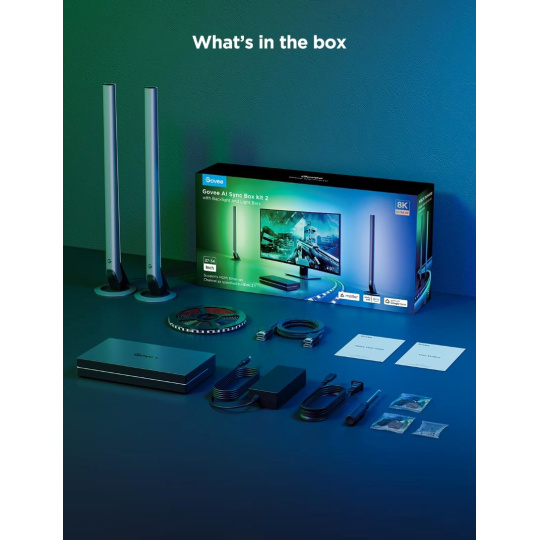Govee AI Sync Box Kit 2 promění vaši domácnost v centrum dokonalého audiovizuálního zážitku díky pokročilé technologii poháněné umělou inteligencí. Navržen tak, aby se k němu mohlo připojit až 4 zařízení jako PC konzole a jiné zdroje HDMI signálu a kompatibilní s monitory o úhlopříčce 27-34 palců, tento kit analyzuje HDMI signál a v reálném čase a promítá barvy přesně odpovídající dění na obrazovce. Díky světelným páskům RGBWIC si užijete precizní reprodukci barev a dynamickou odezvu, které vytvoří okolní atmosféru, jež přivede každý moment k životu. Jako doplnění maximálního zážitku obsahuje systém taky RGBICWW LED panely, které vedle monitoru ještě rozšíří osvětlenou plochu.