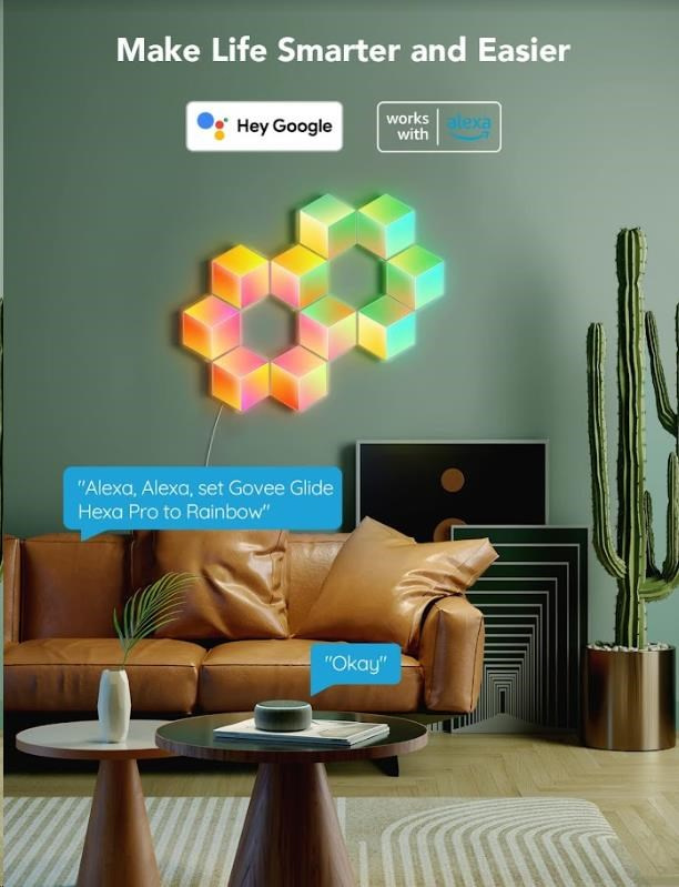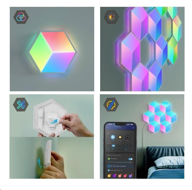 Govee Hexa Pro nabízí 38 různých režimů pro dokonalé naladění světelné atmosféry. Govee technologie RGBIC umí zobrazit až 57 barev najednou z celkové škály 16 milionů barev při intenzitě 1-100%. Může se také pochlubit životností až 50.000 hodin.