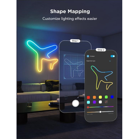 Pomocí aplikace Govee Home a fotoaparátu na svém telefonu můžete vytvořený tvar jednoduše přenést do aplikace a mapovat na něj barvy a efekty. To přináší zcela novou úroveň ovládání, tvary jsou názorně zobrazené a celý proces DIY nastavení je tak velice jednoduchý a časově nenáročný. Nastavit můžete i intenzitu, a to v kompletním rozmezí 1-100 %.