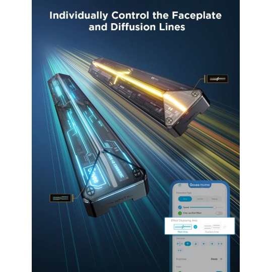 Tato světla poskytují mnoho designových možností. Panel je možné rozdělit na samostatné barevné segmenty, kombinovat přímé a rozptýlené světlo, přidávat efekty, měnit směr toku světla a mnoho jiných. Aplikace Govee Home je nástroj pro kompletní kontrolu světla.