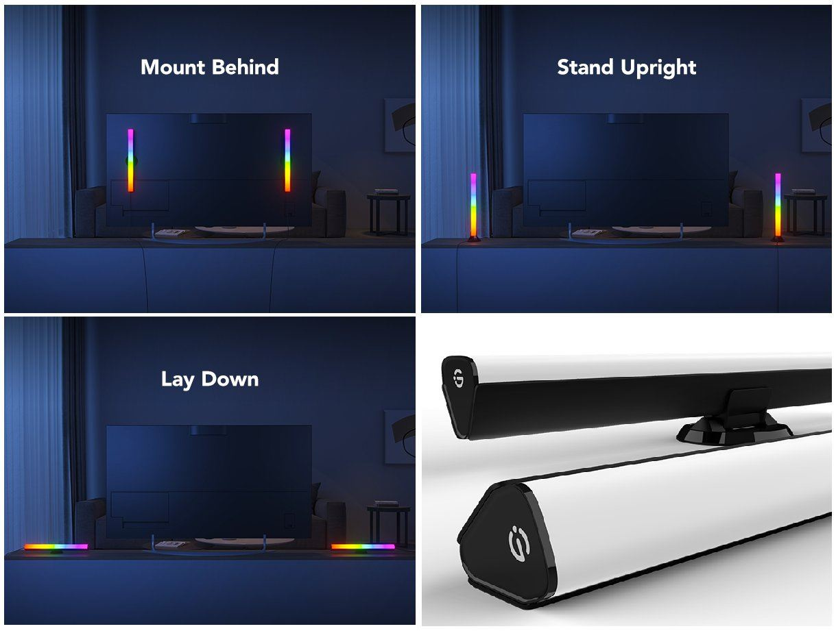Tato světla poskytují mnoho designových možností. Stojany a nástěnné držáky vám umožní instalovat je vodorovně nebo svisle na rovném povrchu nebo připevnit k vašemu PC/TV pomocí 3M pásky. Panel je možné rozdělit na samostatné barevné segmenty a kombinovat jejich barevné provedení.