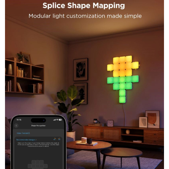 Světla lze snadno připevnit pomocí předinstalované 3M pásky, což znamená, že žádné vrtání ani komplikace nejsou potřeba. Balení obsahuje 10 panelů, které můžete libovolně kombinovat do různých tvarů a sestav – dokonce je možné propojit až 70 panelů najednou! Ovládání světel je snadné díky chytré aplikaci, která umožňuje výběr z přednastavených scén, hudební vizualizace i vlastní nastavení barev.
