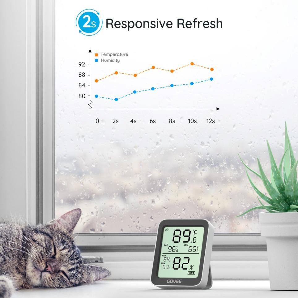 Díky obnově měření každé 2 sekundy máte vždy k dispozici aktuální informace v reálném čase. Tento rychlý refresh eliminuje zpoždění a zajišťuje maximální přesnost při sledování změn prostředí. Funkce je ideální pro prostředí s kolísavou teplotou nebo vlhkostí, jako jsou skleníky či dětské pokoje. Rychlá odezva senzoru vám umožní okamžitě zasáhnout, pokud se podmínky změní.