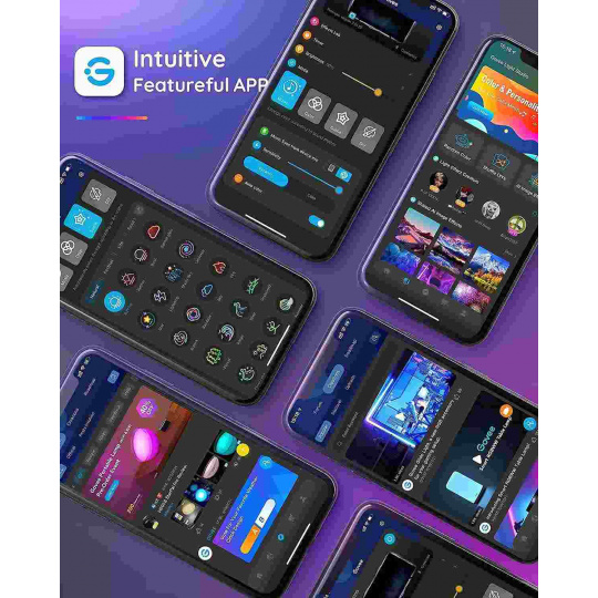 Spravujte nastavení barev a intenzity světla jednoduše pomocí aplikace Govee Home. Aplikace je zdarma ke stažení v Google Play a AppStore. Navíc získáte přístup k funkci časovače, DIY barvám, režimu videa, synchronizaci hudby a režimům scény.