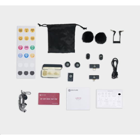 LARK M2 se dodává se sadou užitečného příslušenství, včetně větrných skel pro nahrávání venku, kabelových konektorů pro snadné připojení a speciálně vyrobeného náhrdelníku pro každý TX. S tímto příslušenstvím budete mít vše, co potřebujete k nastavení zařízení LARK M2 a k využívání jeho funkcí.