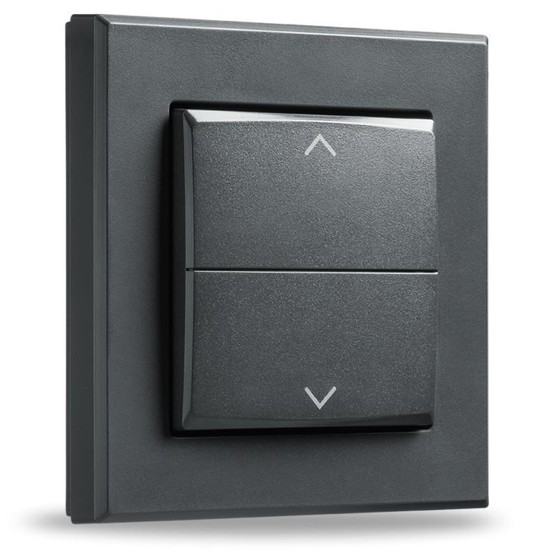 Kryt kolébkového vypínače se symboly šipek a rámečkem v antracitové barvě (HmIP-BRA-A) pro programovatelné bezdrátové akční členy (HmIP-BRC2, HmIP-BROLL, HmIP-BBL, HmIP-BSM, HmIP-BDT) o velikosti 55 mm je součástí systému chytré domácnosti Homematic IP.