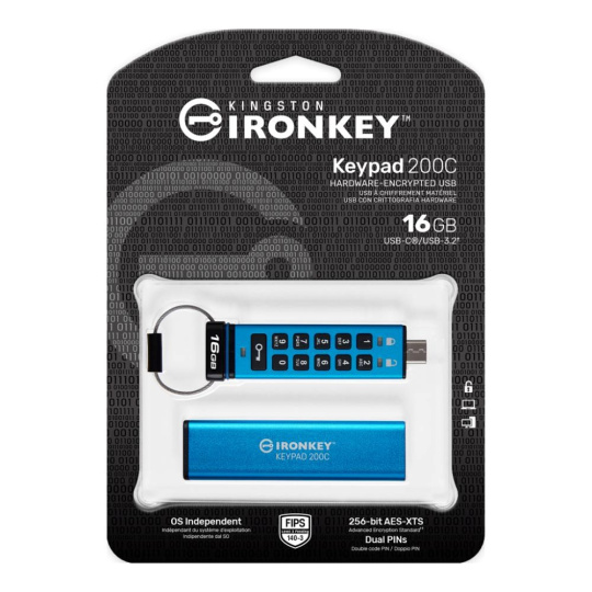 Řada Kingston IronKey Keypad 200 se skládá z hardwarově šifrovaných disků USB typu A a USB typu C nezávislých na operačním systému s alfanumerickou klávesnicí pro snadný přístup pomocí kódu PIN. KP200 obsahuje 256bitové hardwarové šifrování XTS-AES. Je také certifikován podle standardu FIPS 140-3 Level 3 (pending) pro zabezpečení vojenské úrovně s vylepšeními, která dále zvyšují laťku ochrany dat. Jeho obvody jsou pokryty vrstvou speciálního epoxidu, který prakticky znemožňuje vyjmutí součástek bez jejich poškození; tento odolný epoxid brání útokům na polovodičové součástky.