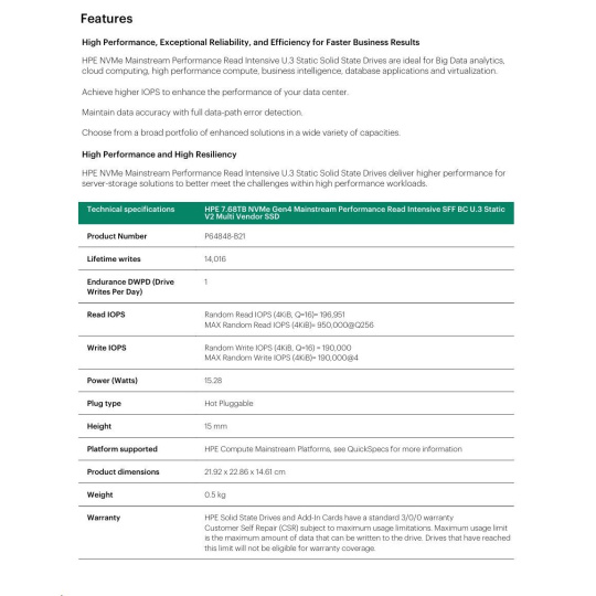 HPE 7.68TB NVMe Gen4 Mainstream Performance Read Intensive SFF BC U.3 Static V2 Multi Vendor SSD.