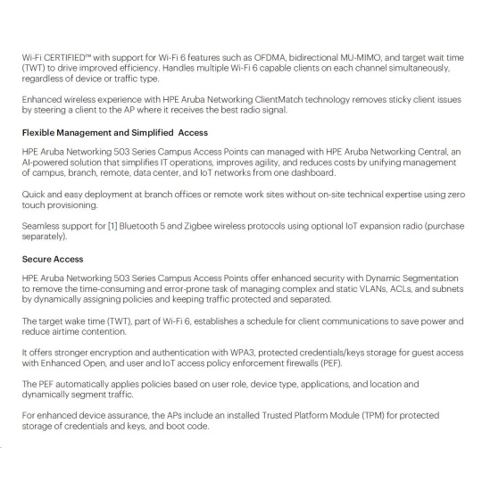 The Aruba 503 Series Access Points (APs) provide cost-effective, high-performance connectivity for any organization experiencing device growth due to increased mobility, the shift to cloud, or IoT. With a maximum real-world aggregate data rate of 1.49 Gbps (HE80/HE20), the 503 Series deliver the speed and reliability needed for medium-density venues and workplaces such as schools, midsize offices, and retailers. Each 503 Series AP provides connectivity for a maximum of 256 associated clients per radio (512 in total).