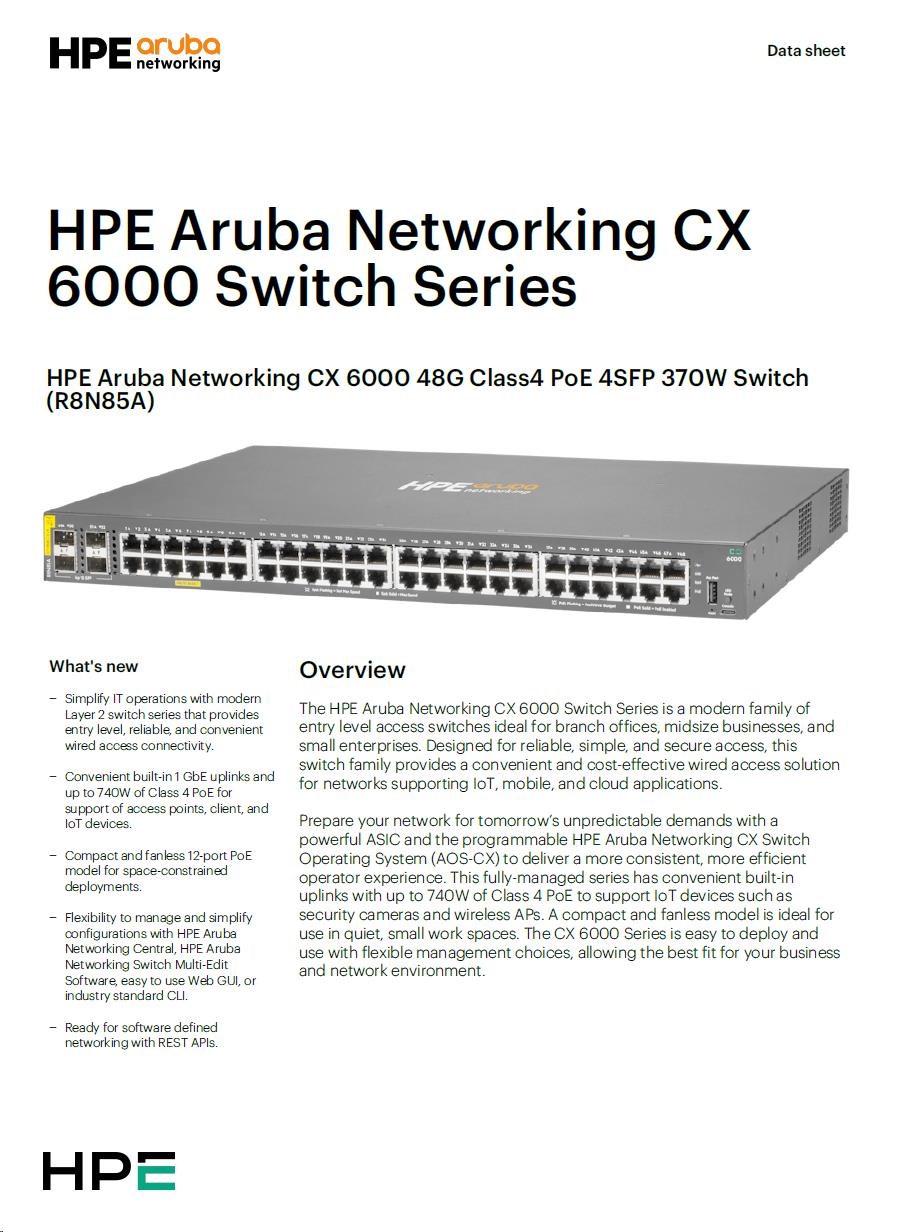 HPE Aruba Networking CX 6000 48G Class4 PoE 4SFP 370W Switch R8N85A RENEW