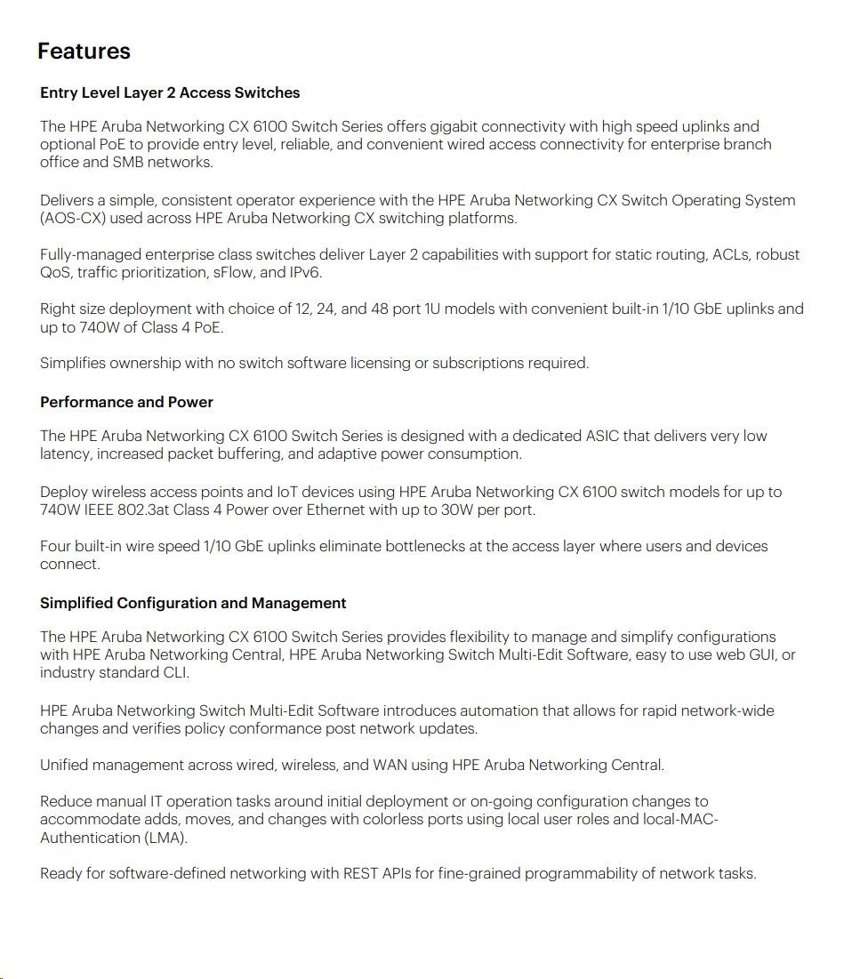 • Runs programmable AOS-CX OS, consistent across Aruba CX portfolio for easy, efficient management.
