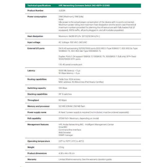 | Management | IMC - Intelligent Management Center; SmartMC; command-line interface; Web browser; SNMP Manager | |