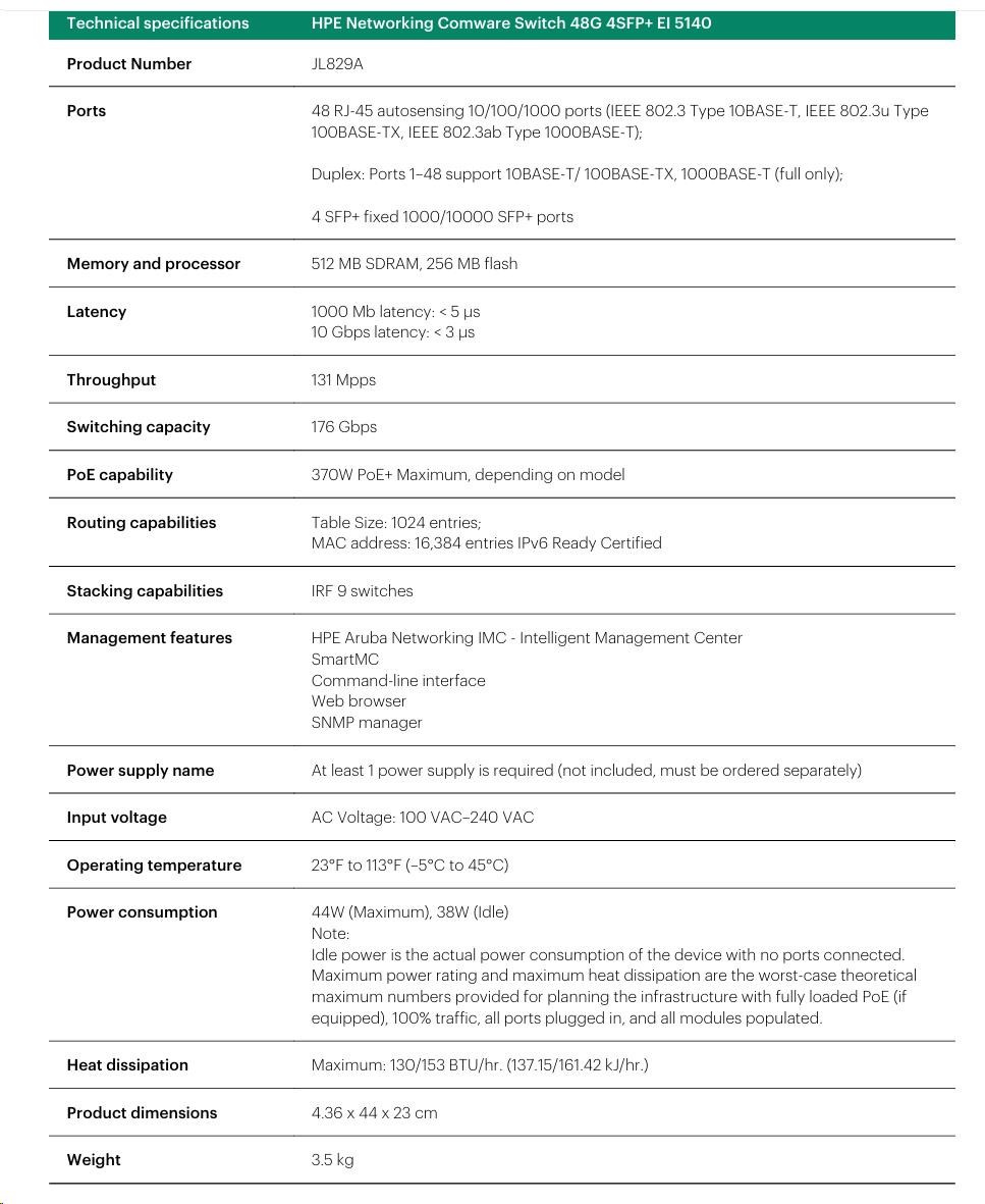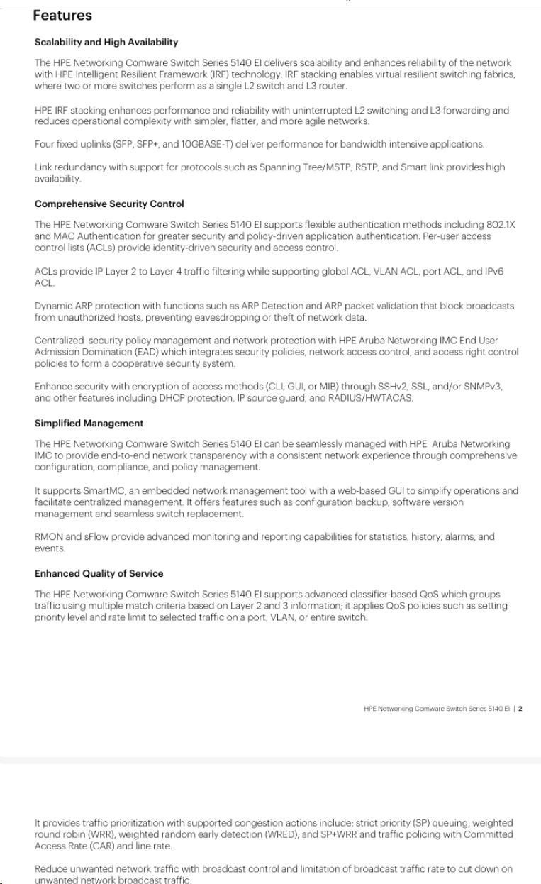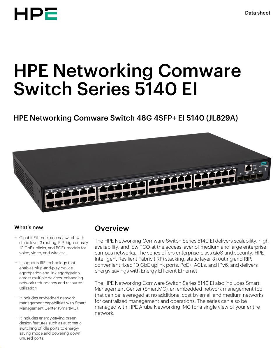 The HPE Networking Comware Switch Series 5140 EI comprises Gigabit Ethernet switches that support static, OSPF and RIP Layer 3 routing, convenient fixed 10GbE uplink ports, PoE+, ACLs, IPv6 and delivers energy savings with Energy Efficient Ethernet. Unique Intelligent Resilient Fabric (IRF) technology creates a virtual fabric by managing several switches as one logical device, which increases network resilience, performance, and availability, while reducing operational complexity. These switches provide Gigabit Ethernet access and can be used at the edge of a network or to connect server clusters in small data centers. High availability, simplified management, and comprehensive security control policies are among the key features that distinguish this series.