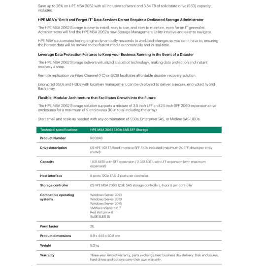 HPE MSA 2062 12Gb SAS SFF Storage Includes an MSA 2060-branded LFF or SFF array chassis depending on model, two MSA 2060 controllers, two 1.92TB Read Intensive SSDs, One Advanced Data Services LTU, two AC power supplies, two .7m PDU cords (IEC C14), one rack-mount kit..