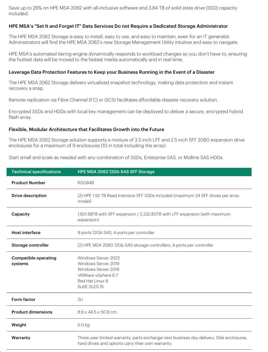 HPE MSA 2062 12Gb SAS SFF Storage Includes an MSA 2060-branded LFF or SFF array chassis depending on model, two MSA 2060 controllers, two 1.92TB Read Intensive SSDs, One Advanced Data Services LTU, two AC power supplies, two .7m PDU cords (IEC C14), one rack-mount kit..