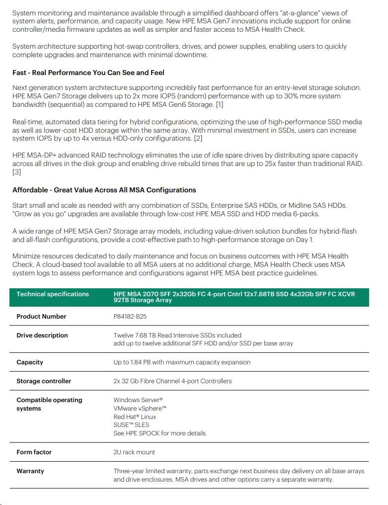 HPE MSA 2070 SFF 2x32Gb FC 4-port Controller 12x7.68TB SSD 4x32Gb SFP FC XCVR 92TB Storage Array Smart Choice.