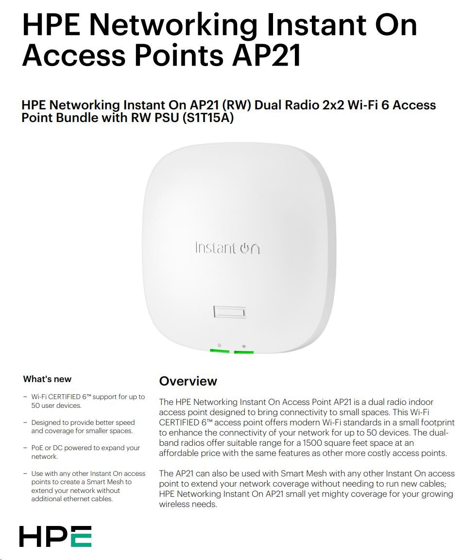 HPE Networking Instant On AP21 (RW) Dual Radio 2x2 Wi-Fi 6 Access Point 5 Pack (+ 5 Mount Brackets).